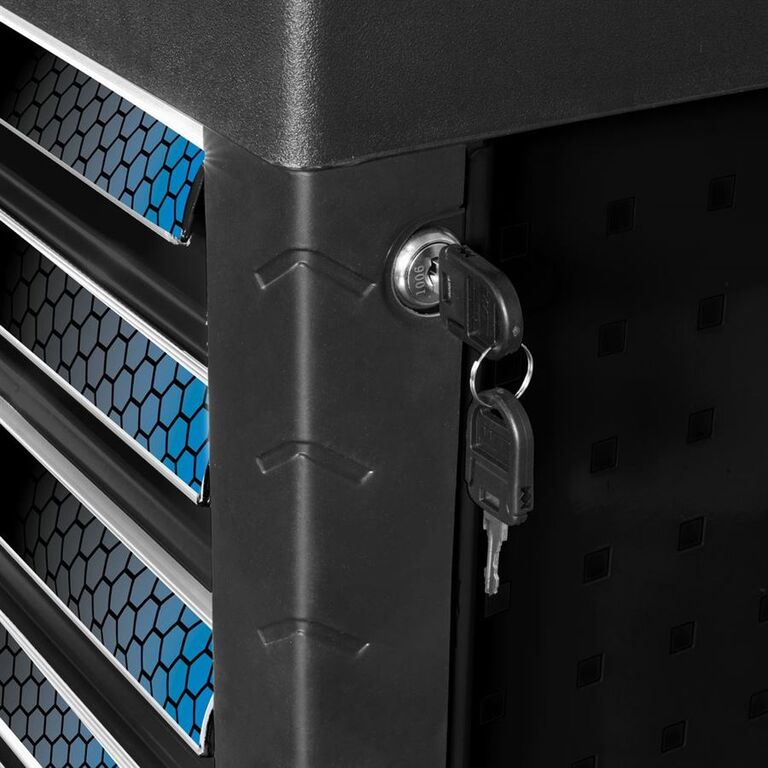 Z hlediska bezpečnosti a stability zaujme ochranou výsuvných zásuvek, ochranou hran, centrálním zamykáním se 2 klíči a parkovacími brzdami na dvou otočných kolečkách, takže vše zůstane na svém místě, i když se vozík přesouvá.