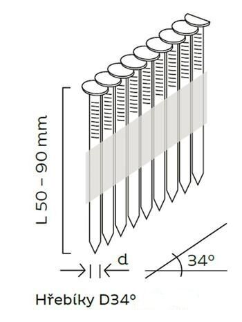 Hladké hřebíky do hřebíkovačky v pásech spojené papírovou páskou se sklonem 34° a D hlavou Vhodné pro veškeré akumulátorové a vzduchové hřebíkovačky které používají sklon hřebíků 34°
