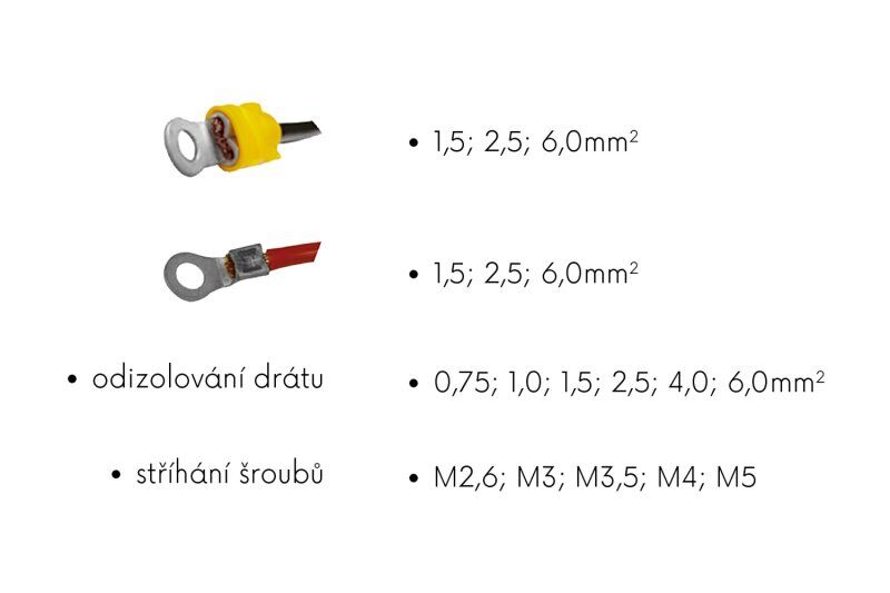 izolované koncovky 1.5, 2.5, 6.0 mm / neizolované koncovky 1.5, 2.5, 6.0 mm / střih metrickým šroubů M2.6, M3, M3.5, M4 a M5 / odizolovávání 0.75, 1.0, 1.5, 2.5, 4.0 a 6.0 mm + B16 : B19